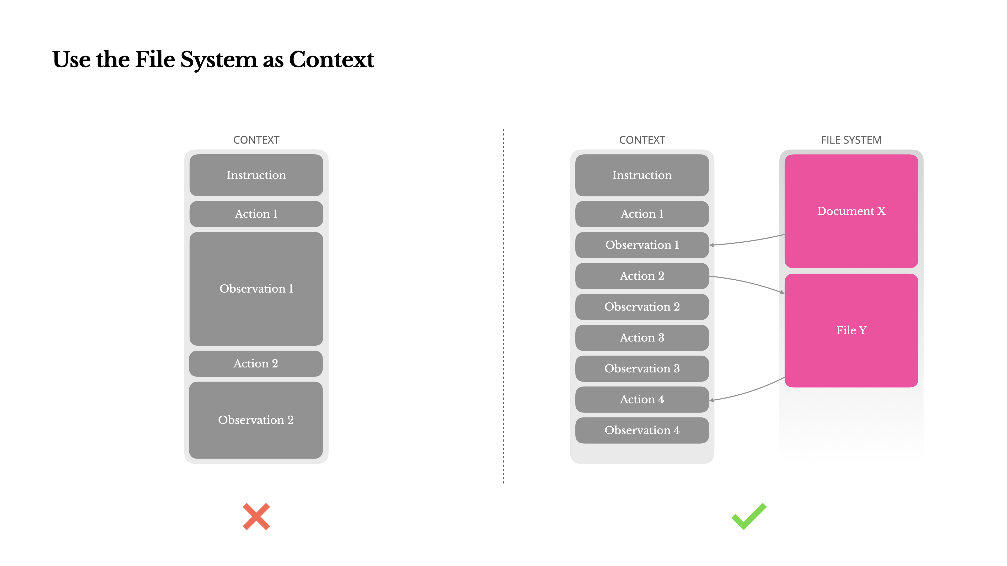 这就是为什么我们将文件系统视为 Manus 的终极上下文:它的大小无限,天然持久,并且智能体可以直接对其进行操作。模型学会了按需读写文件——将文件系统不仅仅用作存储,而是作为结构化的外部记忆。