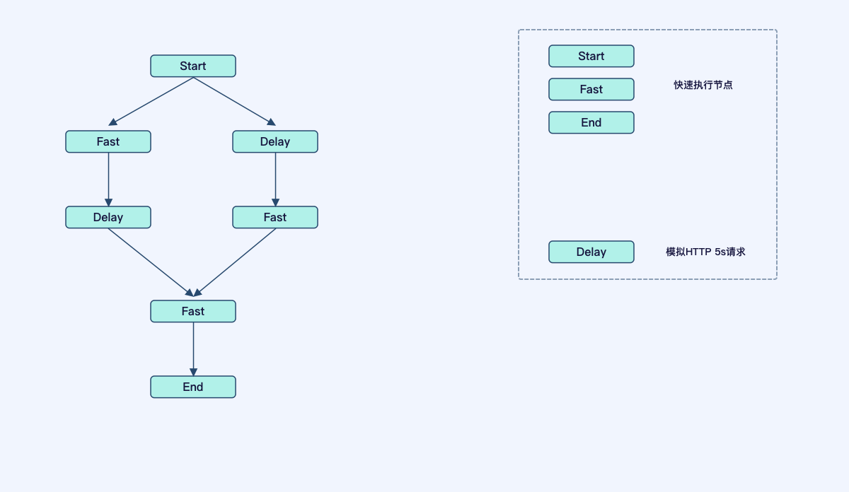 首先DAG如下图所示,Dealy节点是一个发起HTTP,5S之后才返回的节点。由于是并发逻辑,那么整个DAG耗时至少是5s。