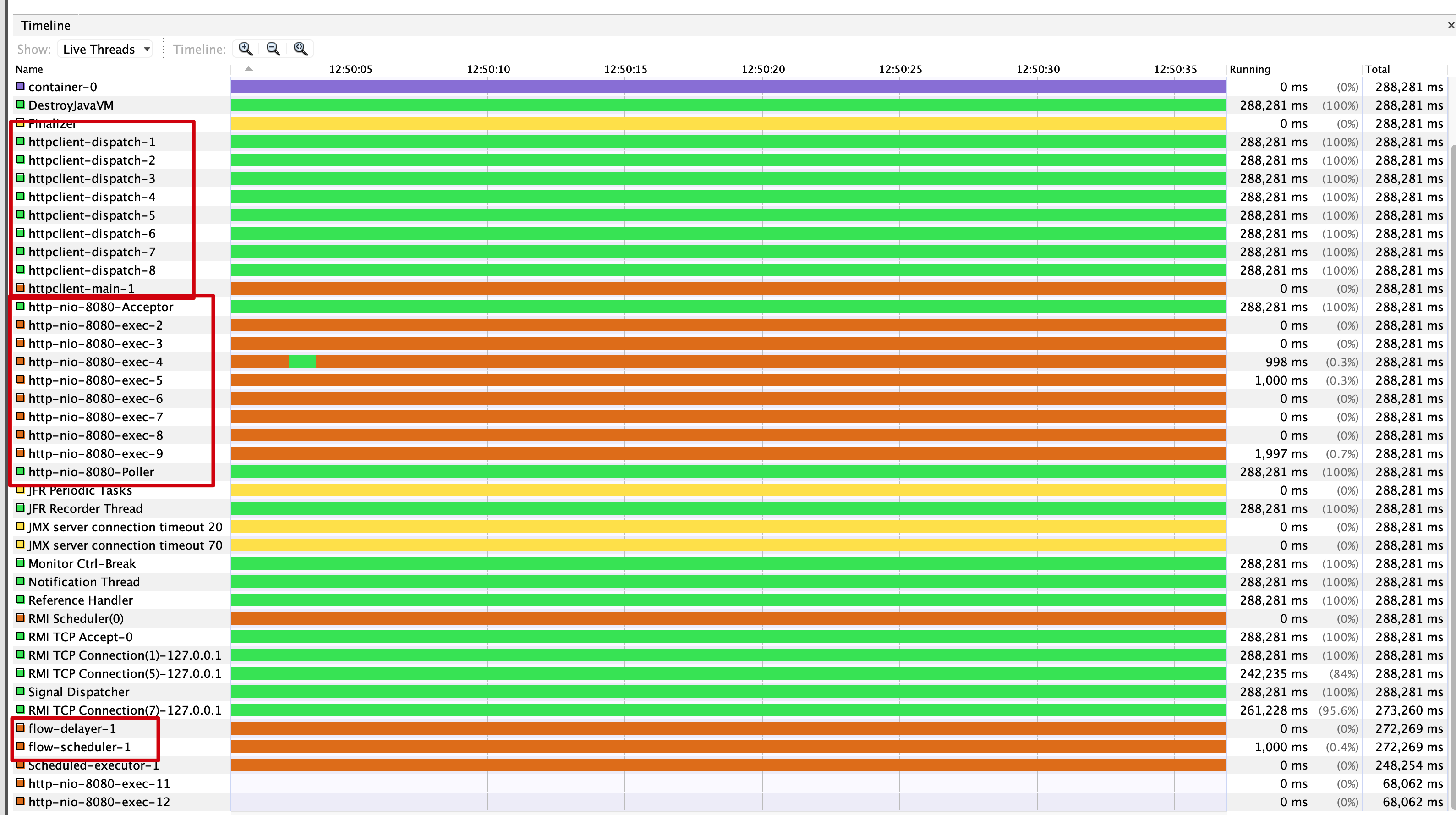 使用Visual监控进程状况,线程使用率还是很低,一直处于park状态(采样是按照1s一次),证明系统还有很大的容量上线。