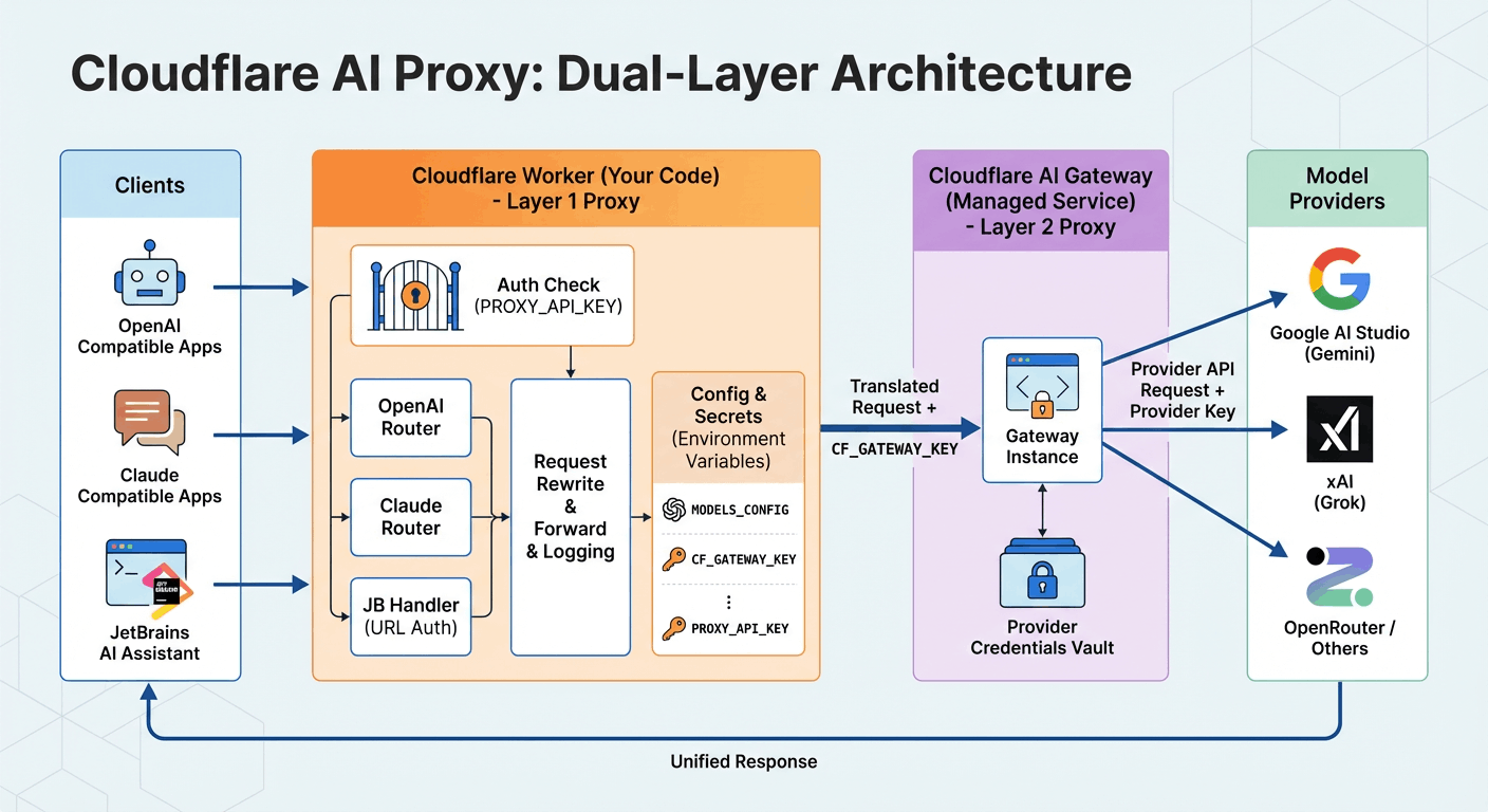 突然发现Cloudflare推出了ai gateway,相比之前worker proxy中自己需要写大量代码的方式,当前只需要做一层代理转发就可以轻松在各种工具中使用,相比其他方案需要本地装个软件,这种云端方案更加让我自己满意(非常讨厌本地运行各种开HTTP Server的服务)